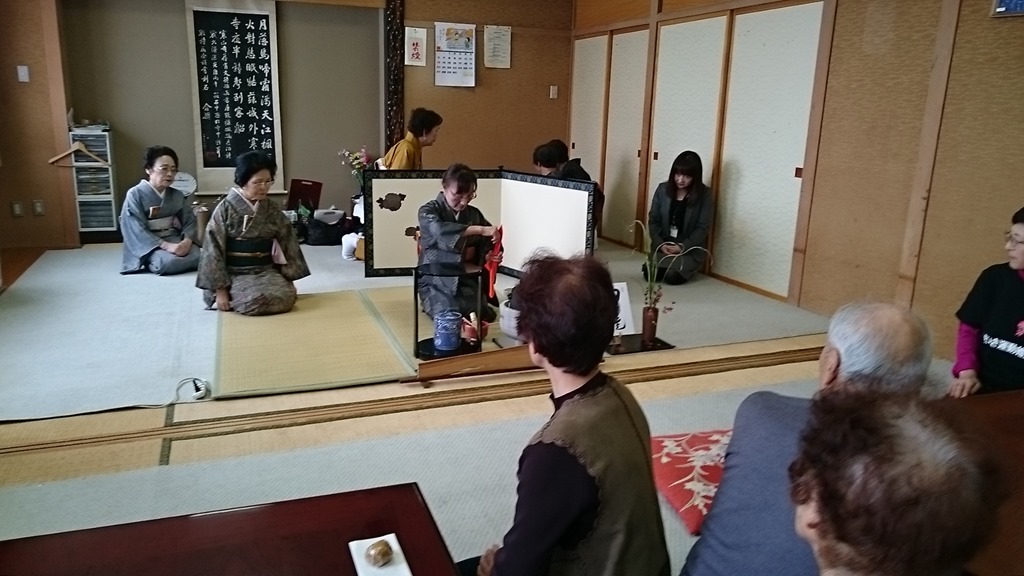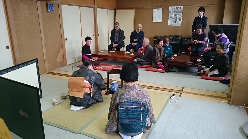 午前11時からは出張公民館講座の「茶道 つくし会」の皆さんにお願いしてお点前を。運動の後に、甘いお菓子と美味しいお抹茶をいただきました。