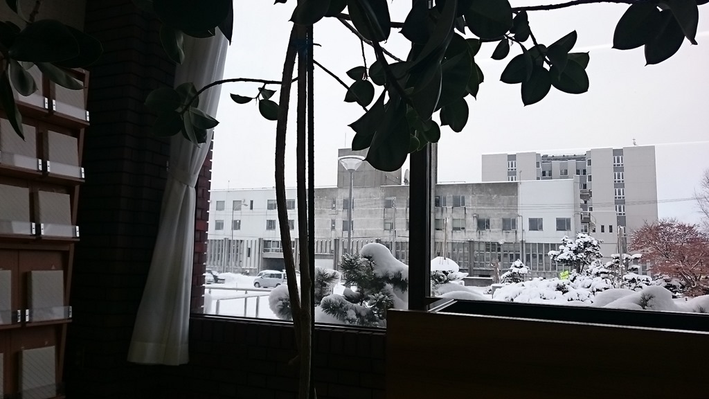 公民館側から見たら、ずいぶん窮屈ですネー。この窓から見える風景もすぐそばに市役所新庁舎となる訳です。