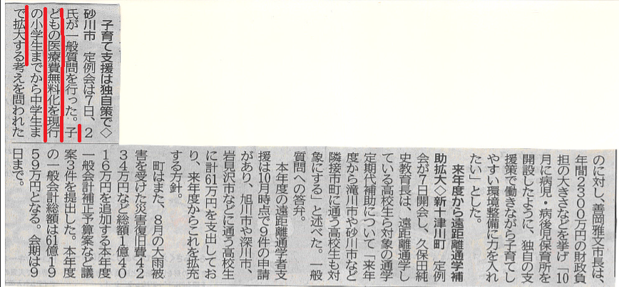 確かに新聞の記事には「子どもの医療費無料化を現行の小学生までから中学生まで拡大をする考えを問われた・・・」とあります。