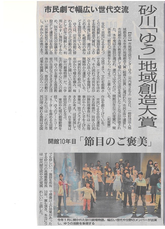 上の写真は昨日の道新空知版に地域交流センター「ゆう」が地域創造大賞を受けたとの内容です。