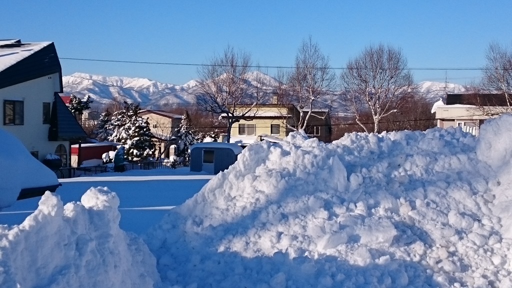 今朝の砂川です。よく晴れて晴見町内会からも樺戸連山が電線越しに綺麗に見えていました。しかし、二日続いた吹雪で、町内の道路は一気に狭くなりました。写真は道路の雪を公園にブルで寄せた雪の山。そんな中・・・
