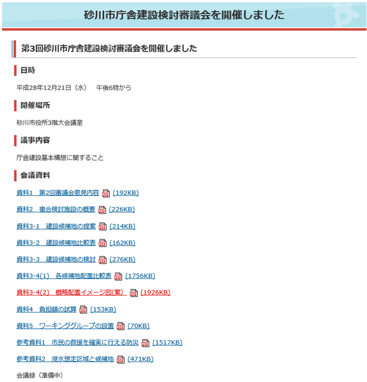 上の写真は砂川市のHPです。12月21日に開催された「第3回 砂川市庁舎建設検討審議会」の会議資料が掲載されています。