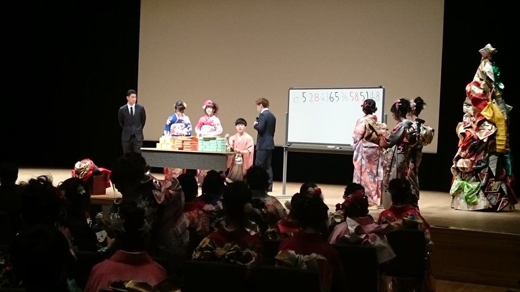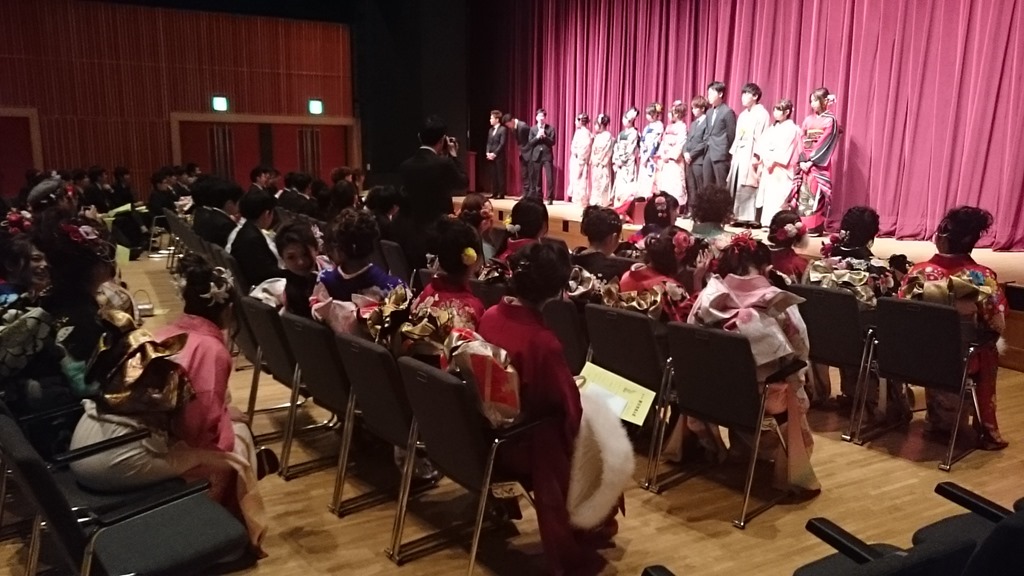 今年は、まず式典が行われ、市民憲章朗唱、式辞(市長)、お祝いのことば(議長)、新成人代表のことば(代表)の順で行われました。また、客席には50人ほどだったでしょうか、ご家族の皆さんも参加されていました。