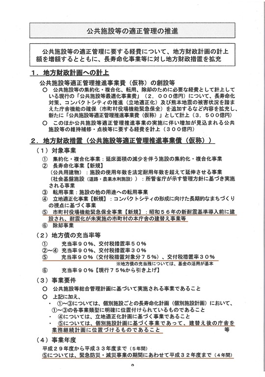 昨日の新年交礼会の市長の「年頭の挨拶」でも触れられていた総務省の「公共施設等の適正管理の推進」について、地方財政措置(公共施設等適正管理推進事業債(仮称))の内容が総務省のHPにありました。