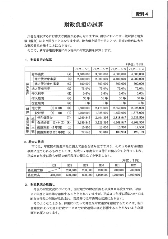 しかし、12月に開催された庁舎建設検討審議会の配布資料の「財政負担の試算(pdf)」が下の写真です。