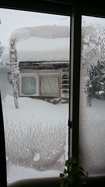 昨晩の12時前までは降っていなかった雪ですが、朝起きてビックリです。かなりの吹雪だったのでしょう、窓にも雪が付いています。