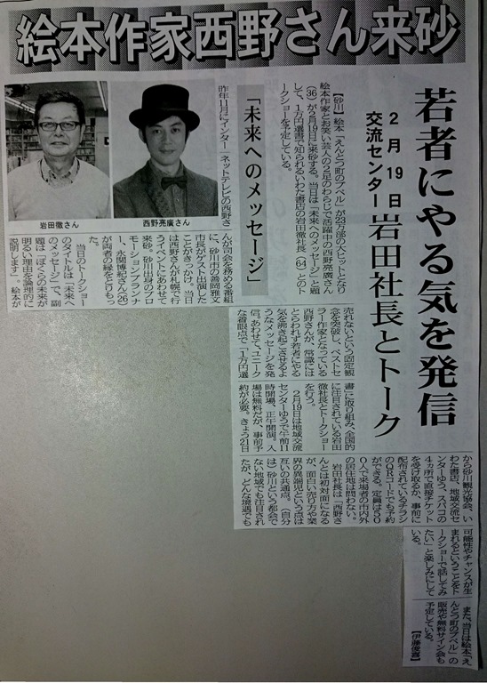 また、このトークショーは西野さんと「いわた書店」の岩田社長が対談するもので、その詳細は21日付の「プレス空知」に掲載されていまして以下の通り。