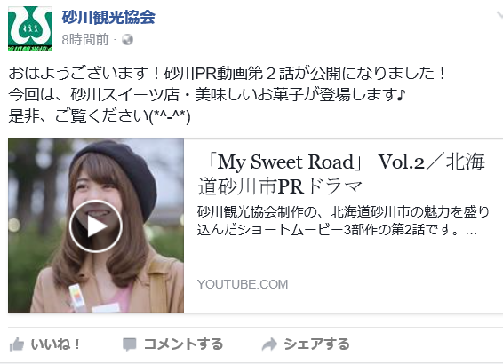 砂川観光協会のFBに、『砂川PR動画第2話が公開になりました!今回は、砂川スイーツ店・美味しいお菓子が登場します♪是非、ご覧ください(*^-^*)』とあります。
