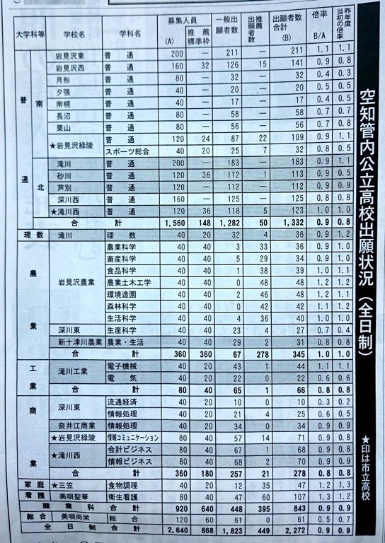 下の写真は1月28日付の「プレス空知」の空知管内公立高校出願状況です。