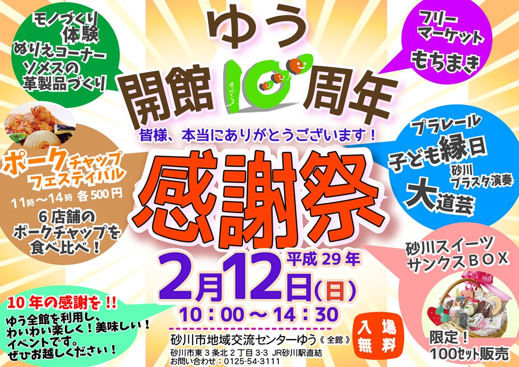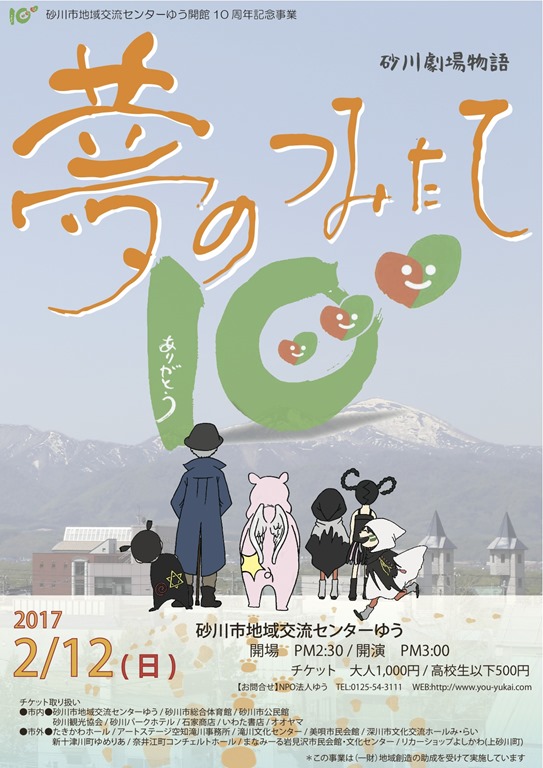 上の二つの写真は2月12日(日)午前10時から「ゆう」で開催される開館10周年の記念イベントとして最後になる「感謝祭」と午後3時開演の「砂川劇場物語 夢のつみたて」というお芝居のチラシです。