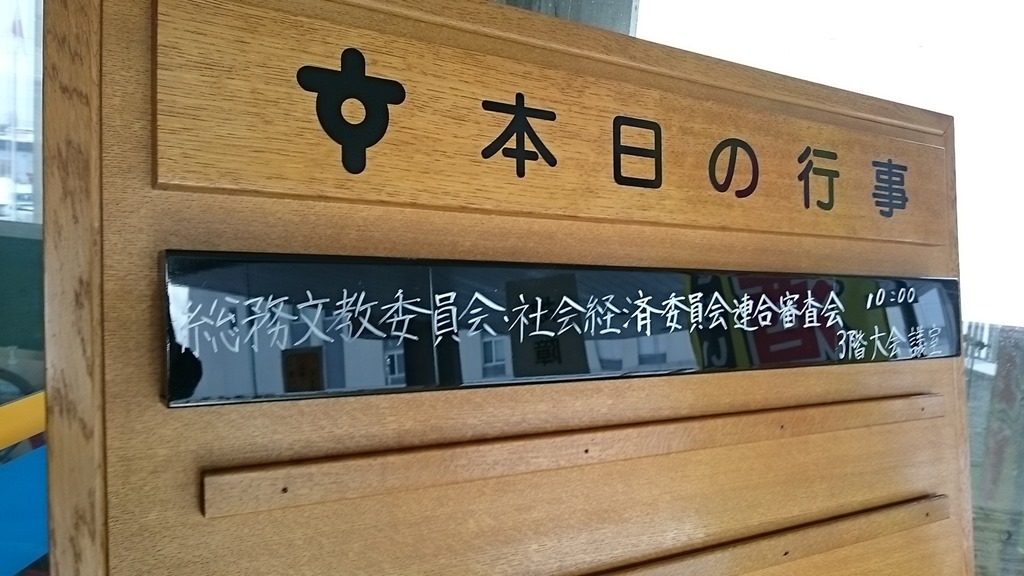 上の写真は本日、午前10時から開かれた「連合審査会」を知らせる、市役所正面玄関右にある告知板です。
