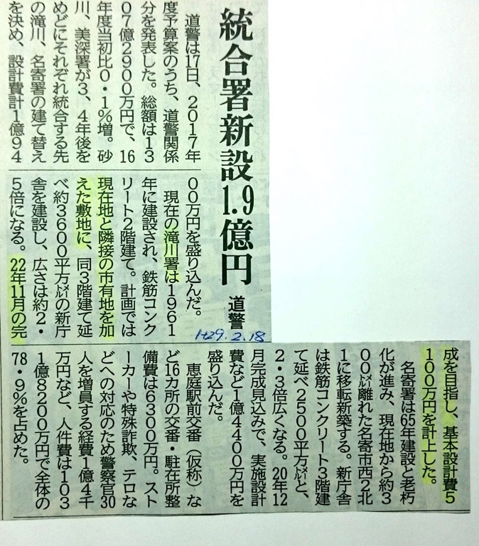 上の写真は2月18日付の道新の記事です。北海道警察は平成29年度予算案を発表したとあります。私が注目したのは滝川警察署が砂川警察署と統合した新庁舎の基本設計費5,100万円が計上されたという部分です。