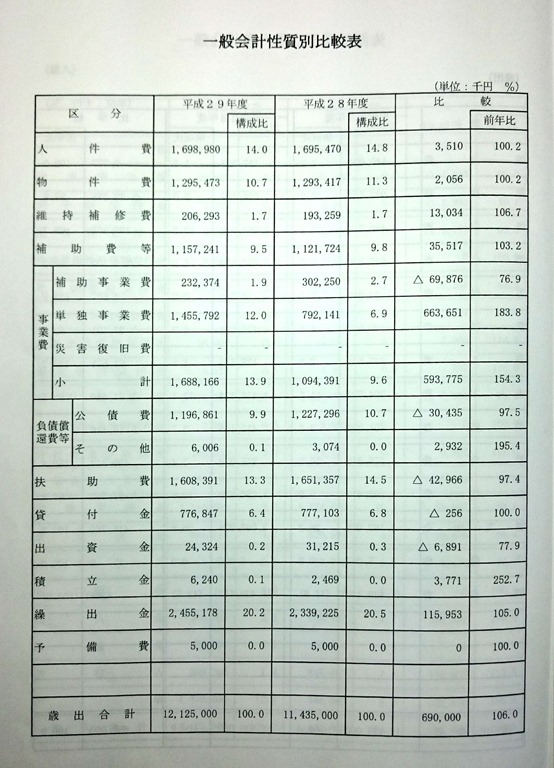 予算の概要からもう一つ「一般会計性質別比較表」を下の写真で掲載します。