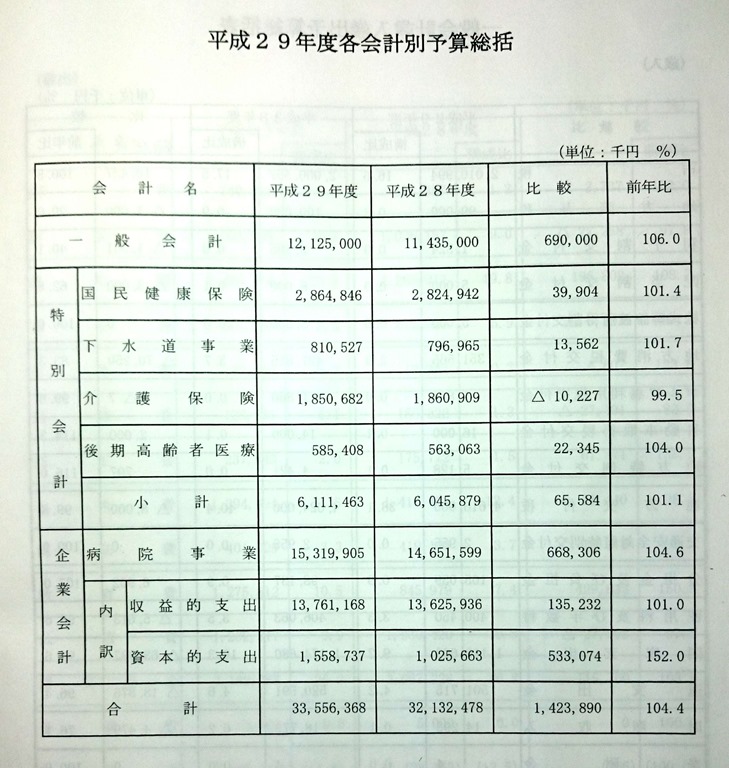 上の写真は砂川市の一般会計、4つの特別会計、病院事業会計の内訳です。一般会計は121億2,500万円で前年度と比べ6億9千万円(6%)の増。一般会計より多い市立病院の予算は約153億1,990万円でこちらも約6億7千万円(4.6%)増です。全会計の合計は335億5,636万8千円の大企業。