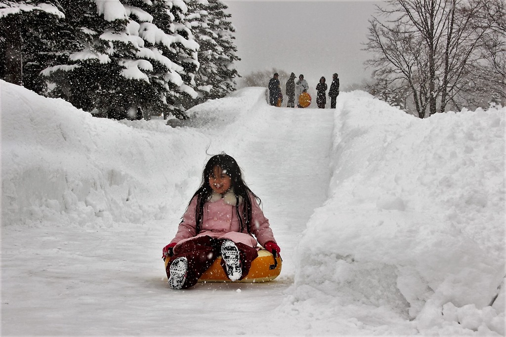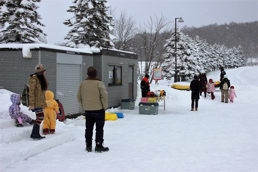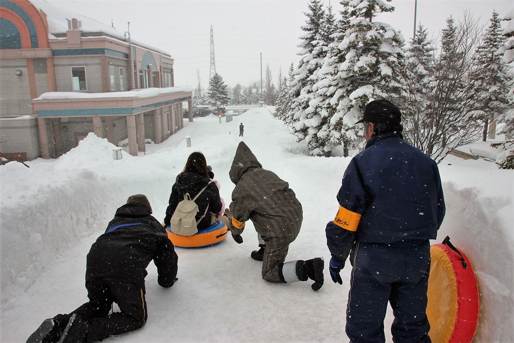 砂川ハイウェイオアシス館の北側に陸上自衛隊滝川駐屯地の隊員が巨大すべり台を作りました。このすべり台は市が管理をするもので、監視員もついていますので安心です。市の経済部によると「市内でも最大級のすべり台」(プレスの記事より)とのこと。
