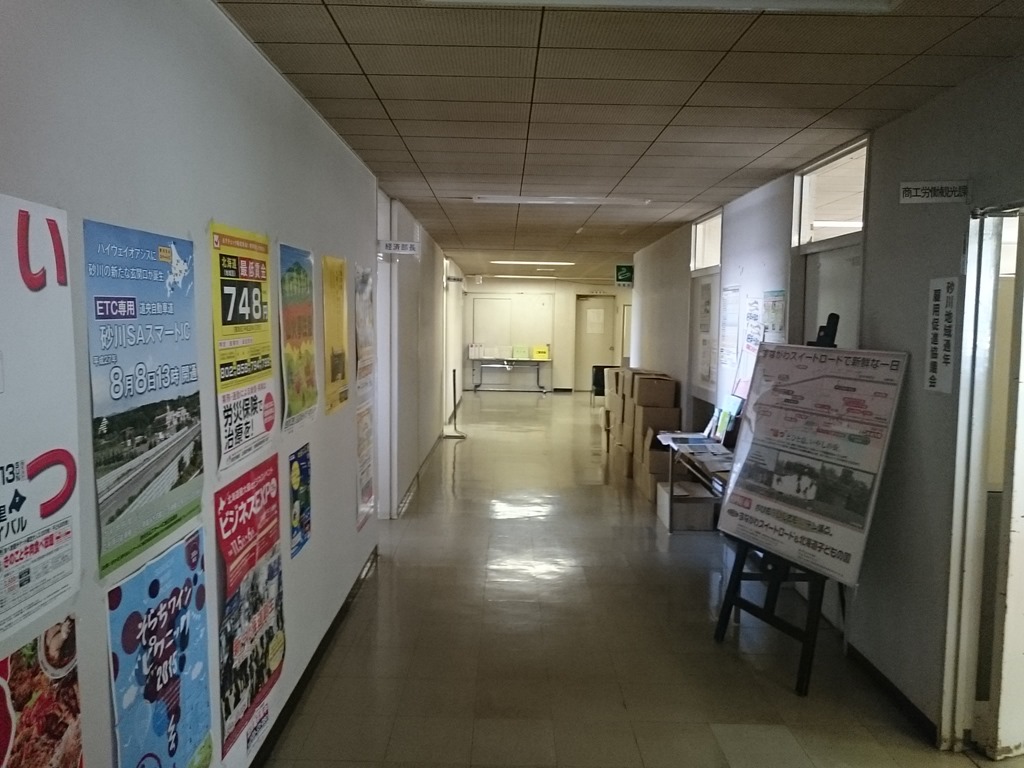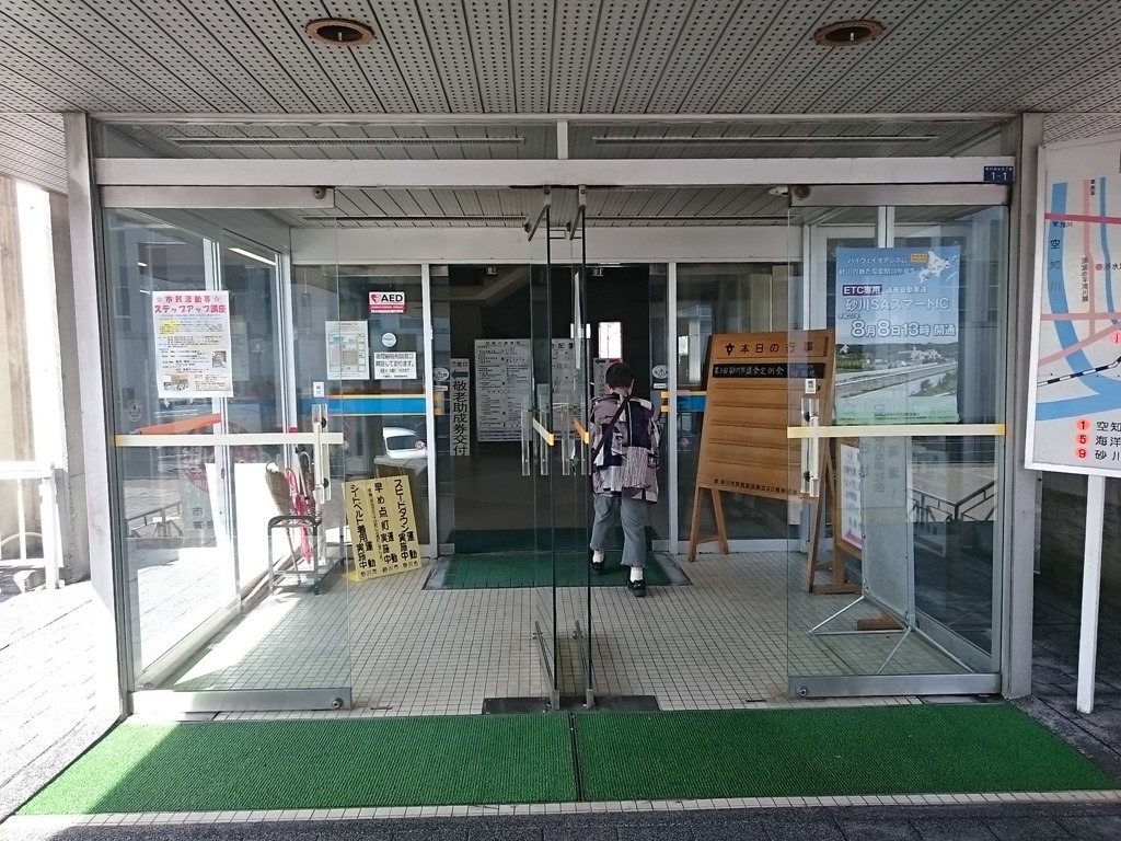ここは砂川市役所の正面玄関です。入って真っすぐ先を見ると階段があります。その階段を3階まで上がります。