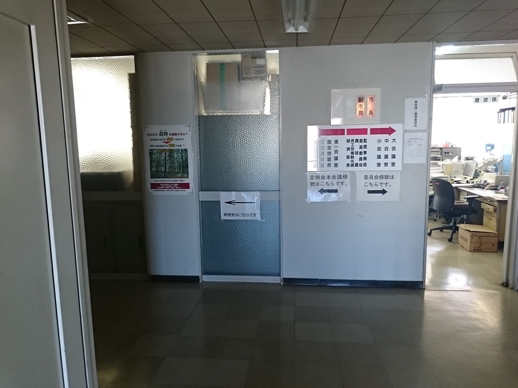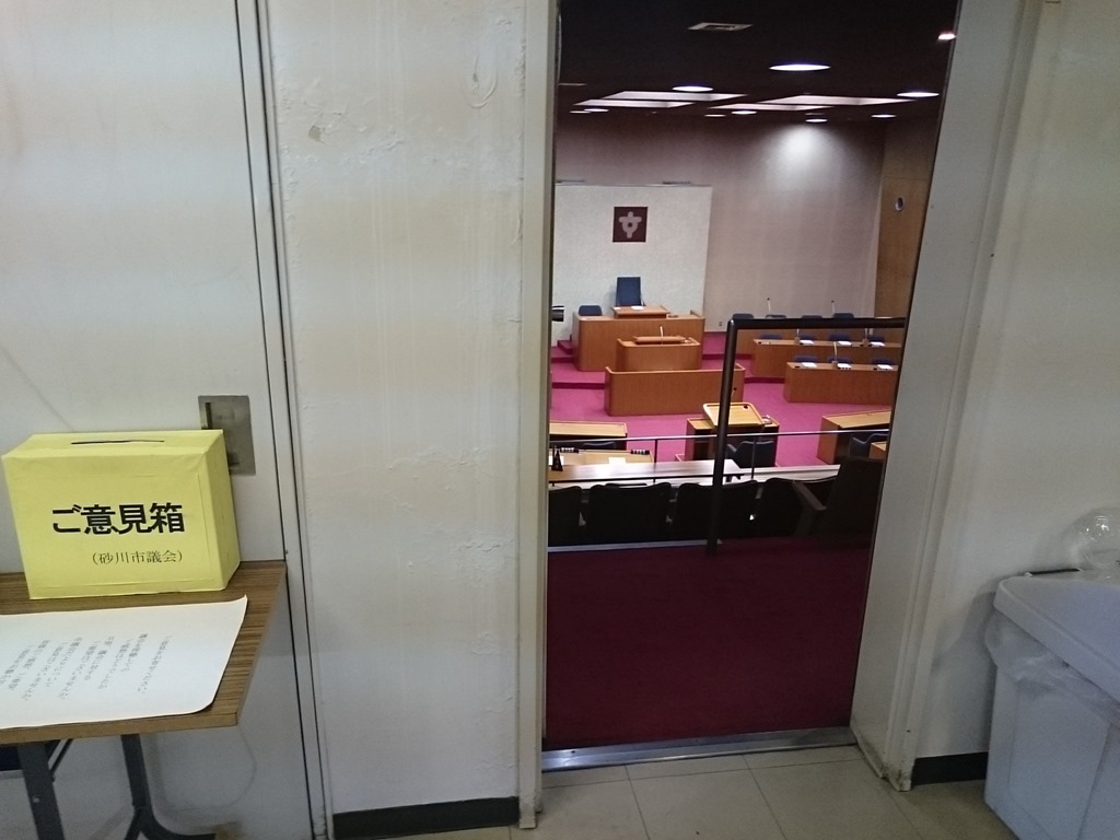 すぐ隣のドアーを開ければ、本会議場に入れますが、ちょっと暗いのと、階段が急なので注意をしてください。議場に入った後は出入りは自由ですが、私たちも真剣に審議をしていますのでお静かにお願いいたします。