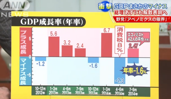 『想定以上の低い数字に衝撃が走っています。17日に発表された7月から9月のGDP(国内総生産)は、年率換算でマイナス1.6%。これを受け、安倍総理大臣は18日にも解散を表明する考えです。』と報じられました。