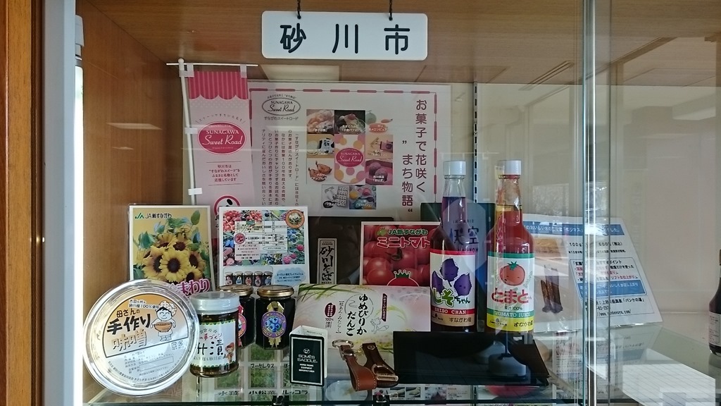 これまで寂しくて気になっていた、空知総合振興局ロビーの空知管内市町の特産物展示コーナーの「砂川市」のブースも充実していました。