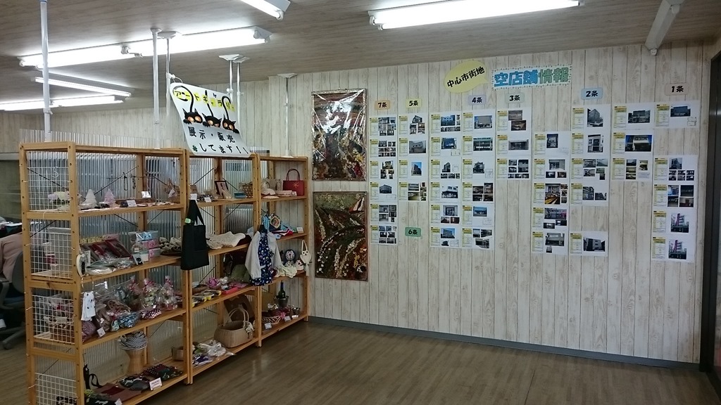 上の写真は空き店舗情報とミニギャラリーのコーナーで、ギャラリーでは手作りの物を手数料無しで販売しているそうです。