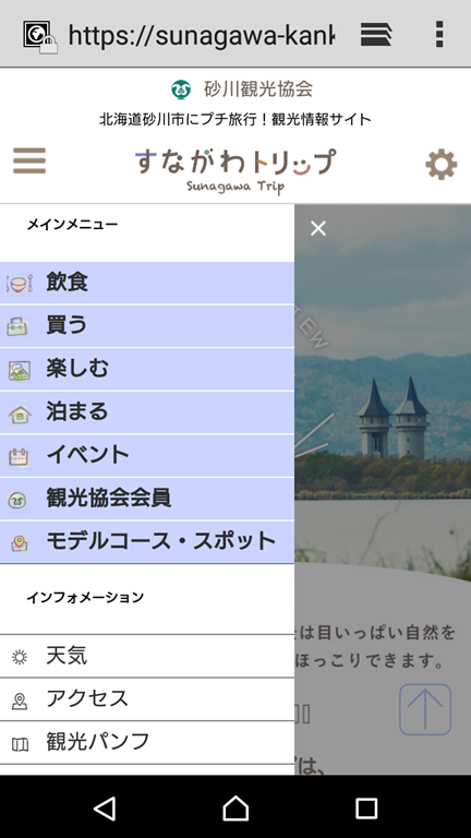 スマホで「砂川観光協会」と検索すると上のような画面が出てきます。私が困ったのが、上で紹介した「飲食」とか「買う」のバナーが表示されていないので、お店を見ることが出来ませんでした。