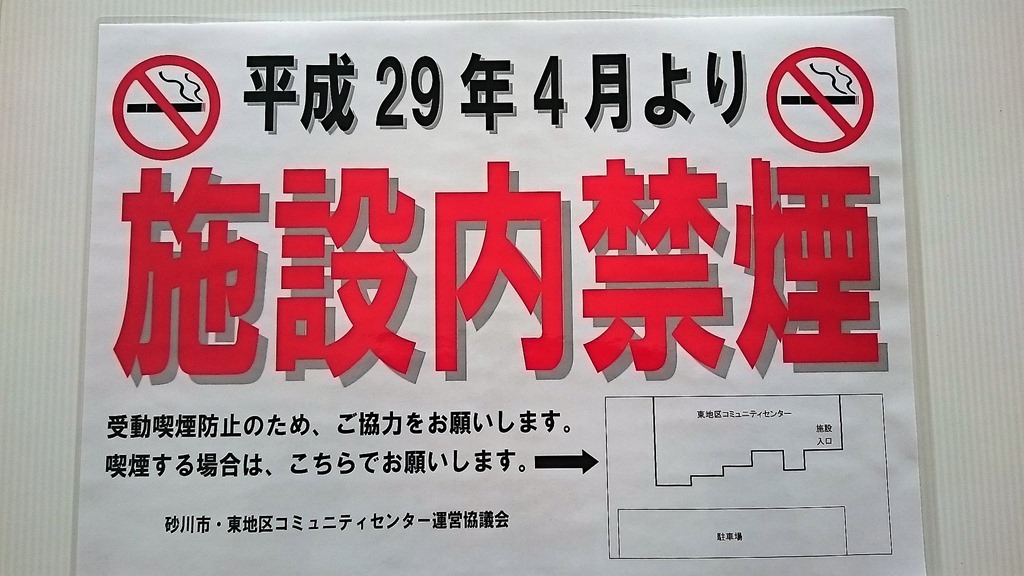 一般質問の時に話したのですが、砂川市の市民部は4月1日から所管する公共施設(コミュニティセンターや老人憩の家)を施設内禁煙にするよう各管理者に協力を依頼しています。