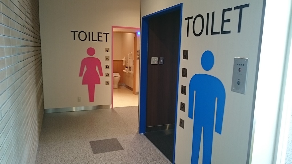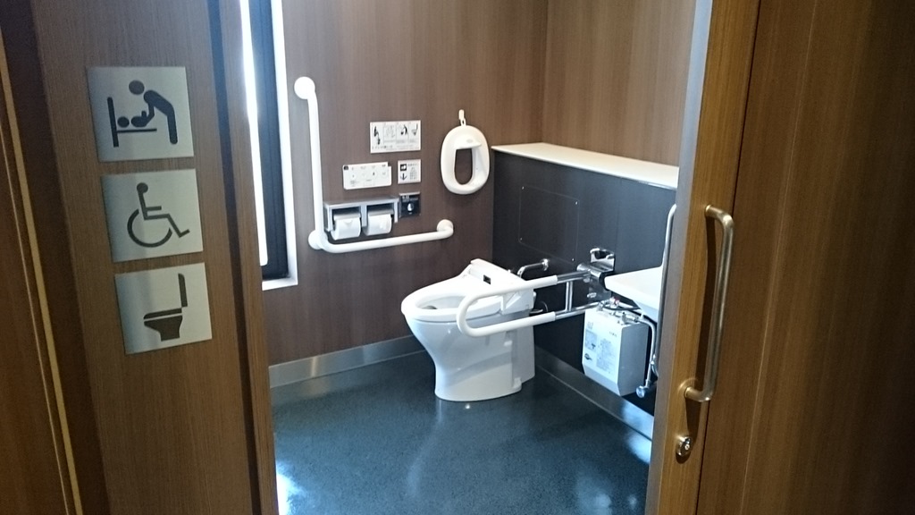 男性用のトイレにも写真のような多目的トイレが設置されて、便利になりました。