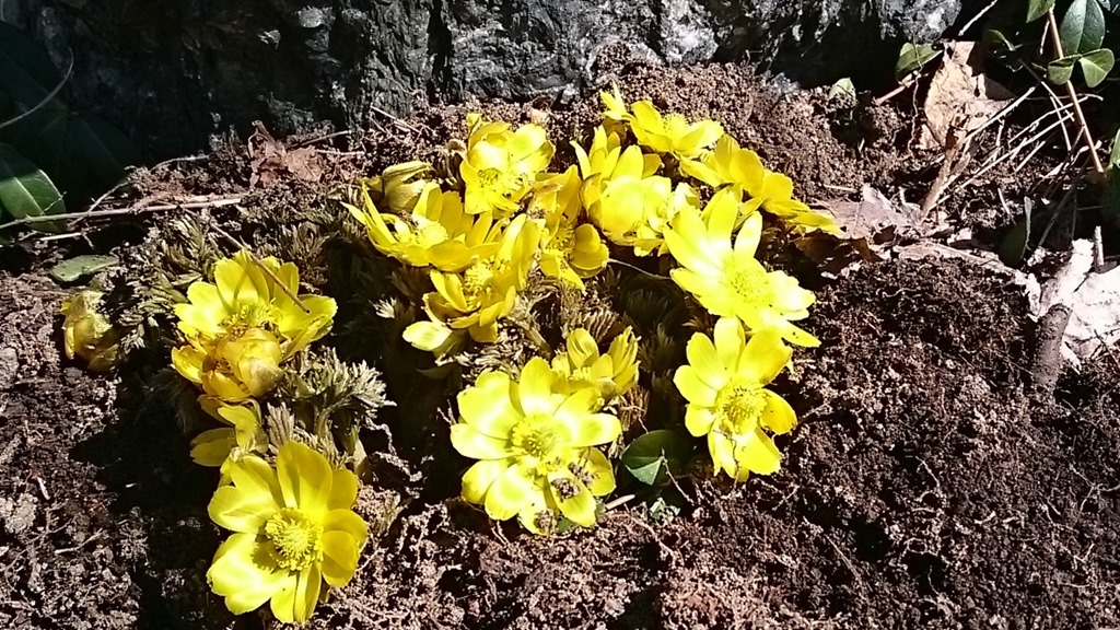住宅地でも福寿草が咲き始めました。これまで探しながら歩いていましたが、なかなか撮れず。でも、今日はいろいろな所で一斉に咲き始めた感じです。