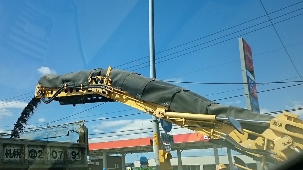 こんな機械を見るのは初めてでした。なんと、ロータリー除雪車のようにアスファルトを飛ばしてダンプに積んでいるではありませんか。