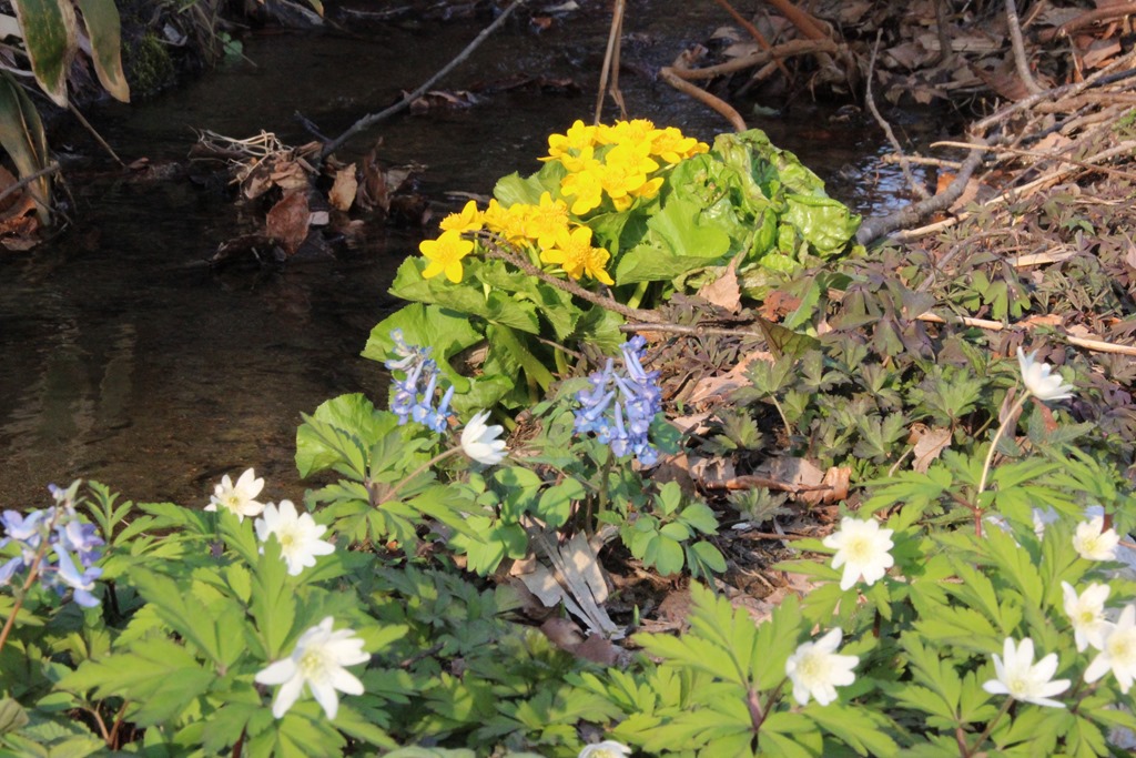 こちらは同じお宅に咲いていた、手前の白い花は「キクザキイチゲ」、真ん中の紫色の花は「エゾエンゴサク」、そして、奥の黄色の花は「ヤチブキ」です。