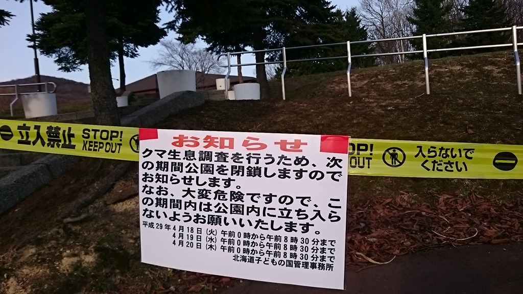 駐車場からレストハウスに向かう入り口は黄色のロープが張られ、クマの生息調査を行うため4月20日まで公園を閉鎖するとの内容でした。