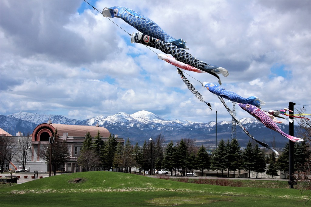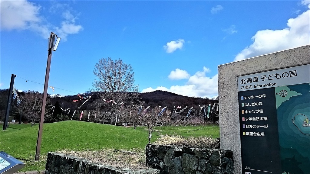 本日の「道立子どもの国」は陽射しも強く帽子がないと大変なぐらいでした。明日から開園となる子どもの国の鯉のぼりを見てきました。