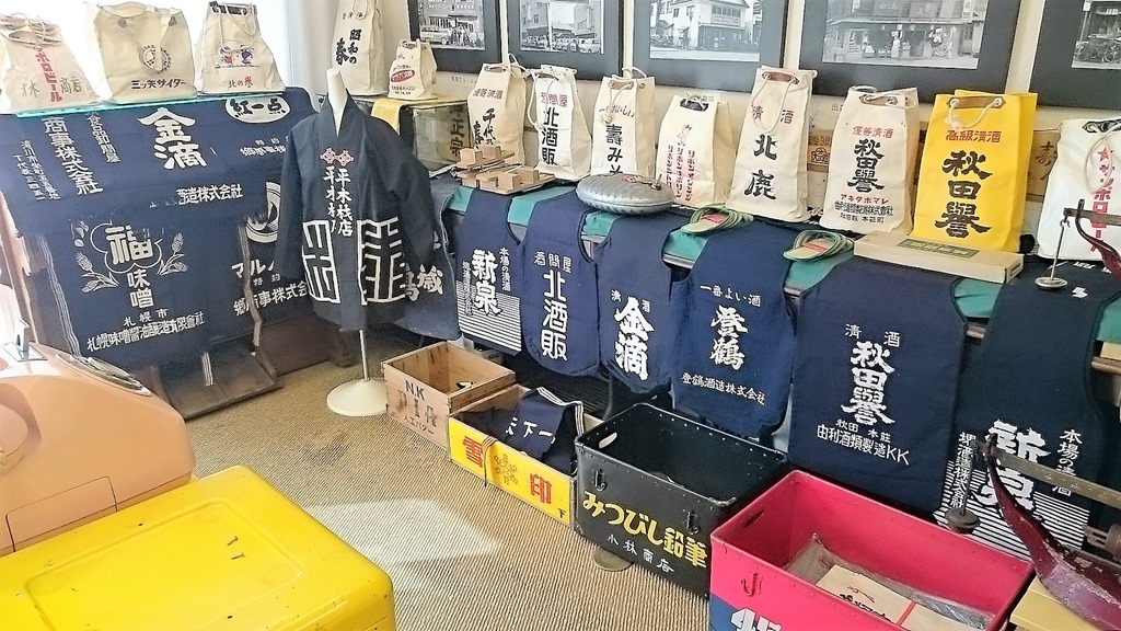 今は無い、歌志内市内の店舗の古い写真や、酒店で使われていた前掛けや一升瓶を運ぶときに使われた布の袋など商店に関わるものが展示されています。