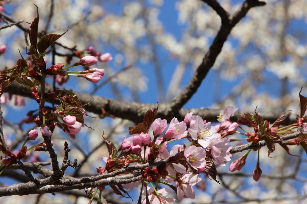 砂川でもこぶしの花が満開ですが、上の写真は桜の花とバックは白のこぶしの花です。