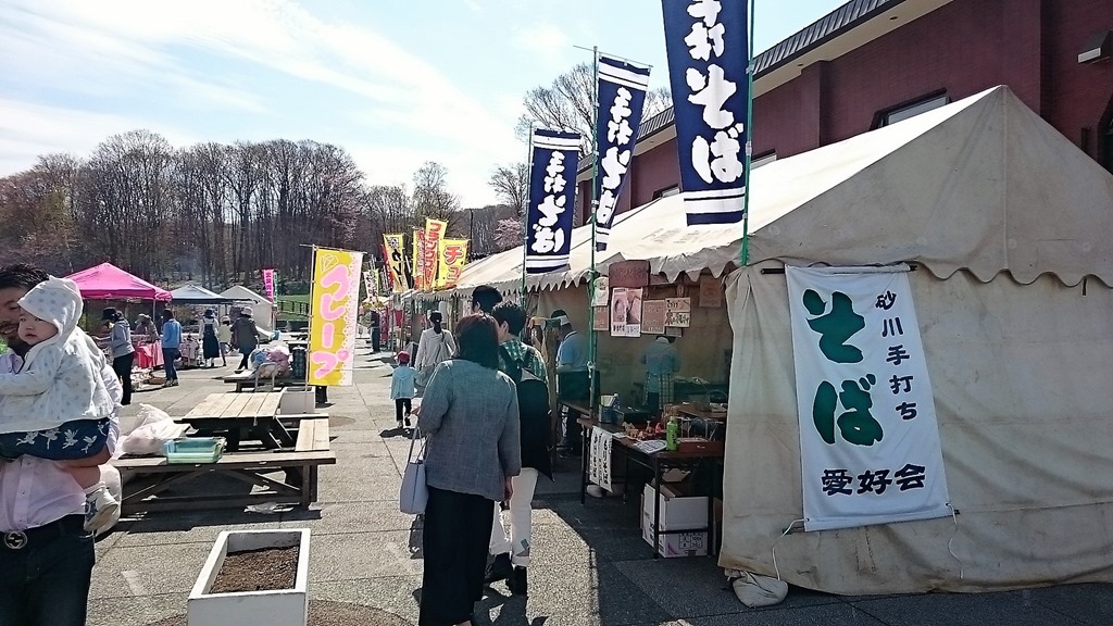 上の写真は、9時頃の子どもの国レストハウス脇の飲食コーナーです。「砂川手打ちそば゛愛好会」は本日のみの出店でした。ちょうど準備が整い一息ついたところですが、今日は朝早くから家族連れが来園していました。