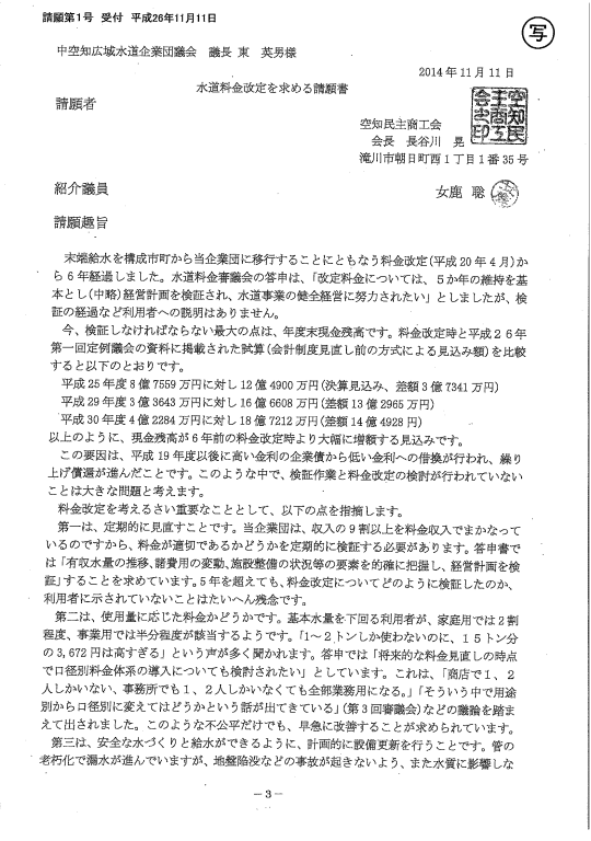 実は明日の組合議会には上の請願書が提出されています。(ちょっと小さくて見づらいですが)困ったことに、この請願書は企業団が以前に資料として議員に提出した誤った物に基づいて作られています。
