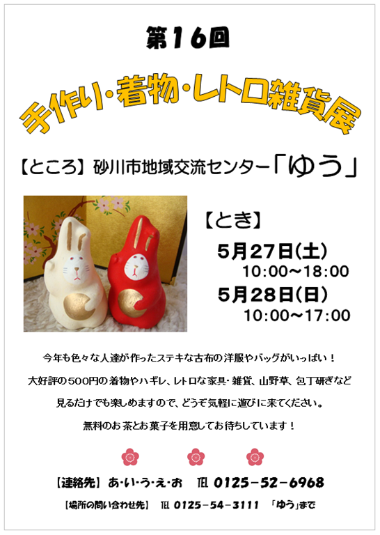 〈宣伝です。「第16回 手作り・着物・レトロ雑貨展」〉