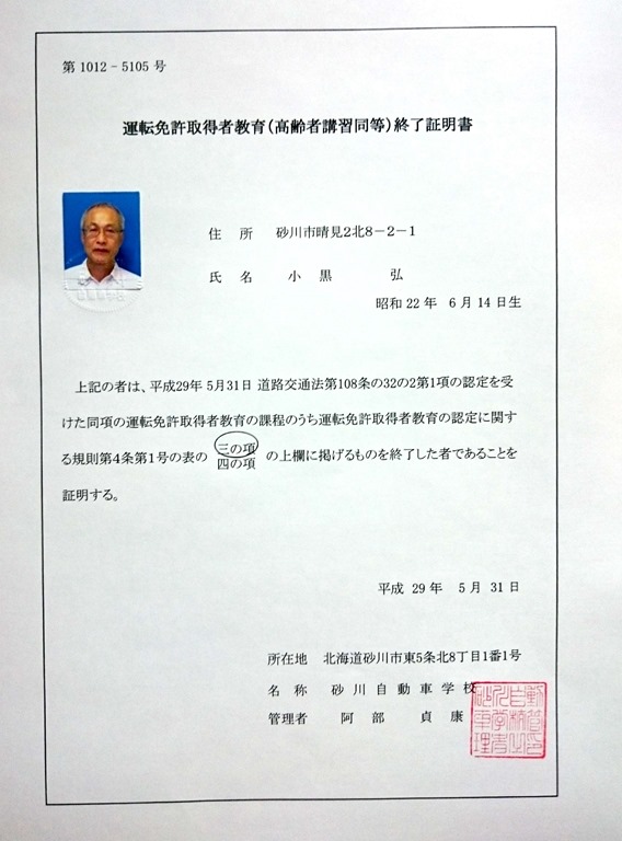行って来ました「砂川自動車学校」。我が家からは歩いても10分ほどの近さですが、今日までは長かった。3時間以上かかった高齢者講習が終わってホッとしています。講習手数料は通常5,600円ですが、私は写真も撮ってもらったので6,480円でした。