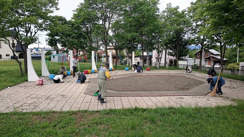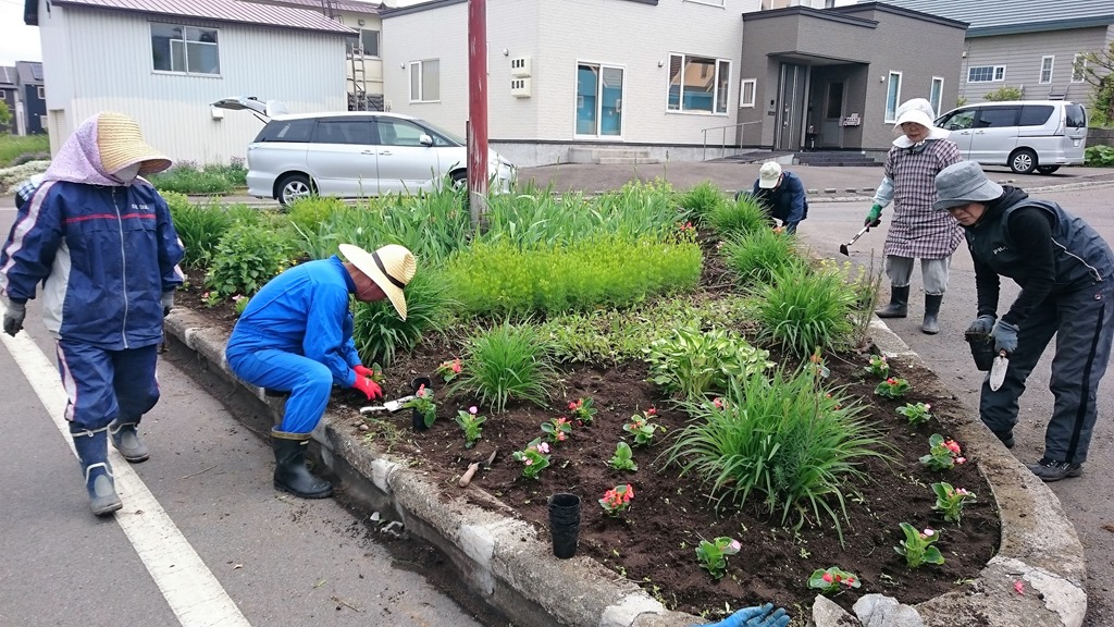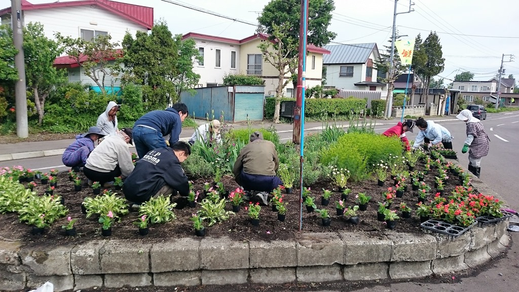 午前8時から晴見町内会では清掃と町内に2ヵ所あるロータリーの花壇に花の苗植えをしました。幸いに作業中は雨に当たらずに済んでよかったです。