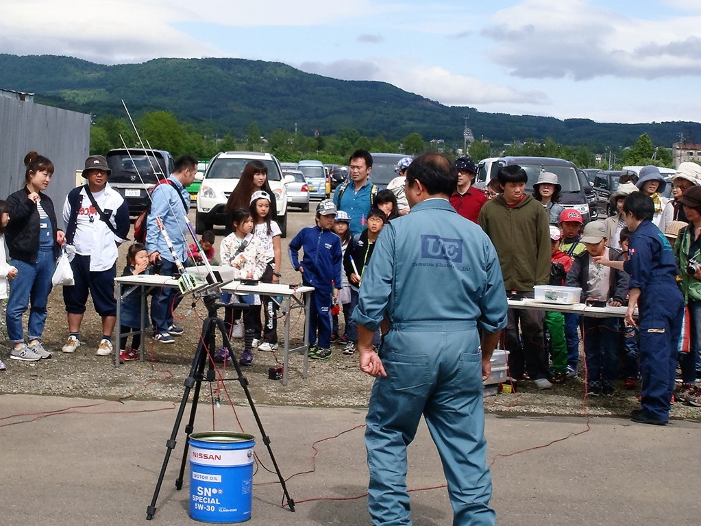 会場はロケットで有名な赤平市の(株)植松電機の外と工場内になるのでしょうか屋内で開かれていました。