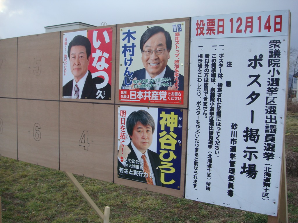 写真は晴見町内会に立っているポスター掲示場です。本日の告示と同時に3枚のポスターが張られました。衆議院小選挙区、北海道第10区です。