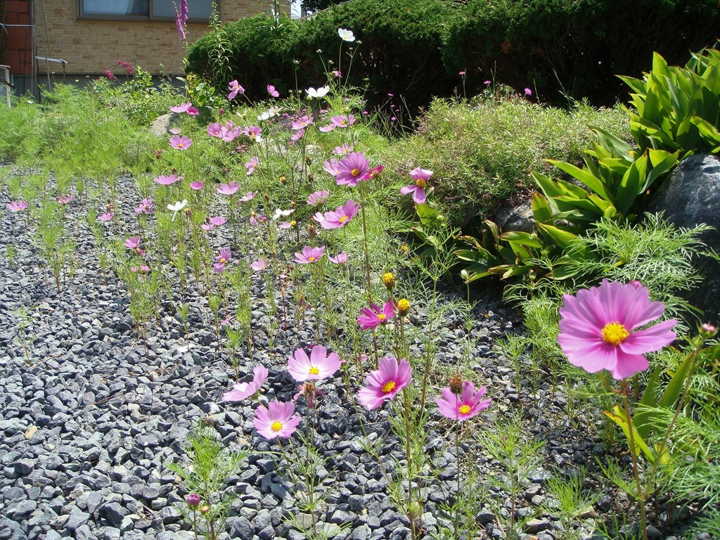こちらは、もう咲いているコスモスです。新石山団地のお宅で見つけました。コスモスは「秋桜」と書きますので、咲くのは秋ですよね。