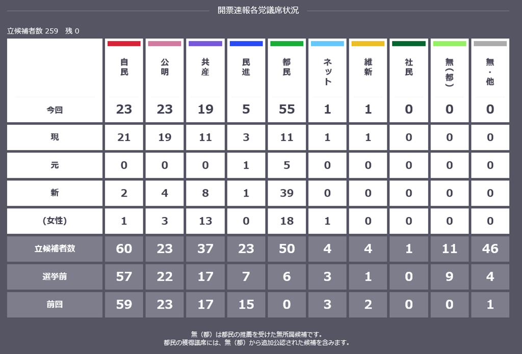 投票結果としては上の写真が見やすいと思って載せましたが、都民ファーストの会の選挙前6名から55名に増えたのは驚くばかりです。