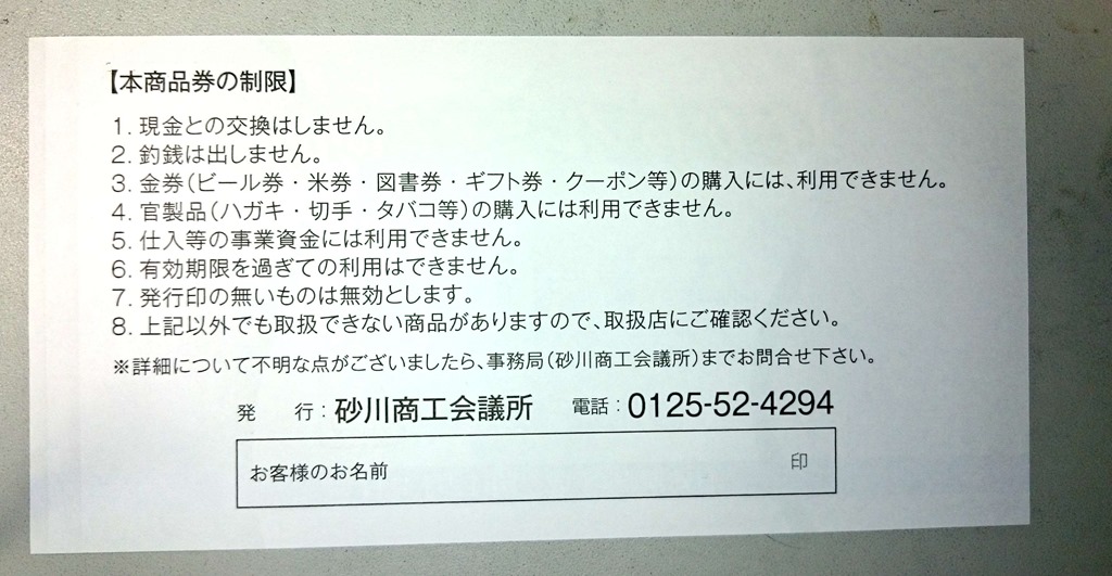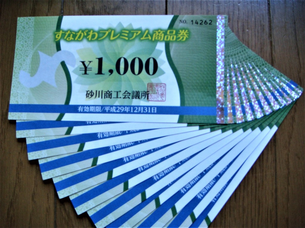 上の写真は今年は私も2セット(1セット1万円)、24,000円分買った「すながわプレミアム商品券」です。