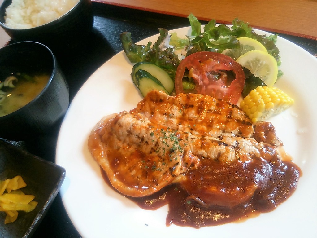 まずは、最近オープンした砂川ハイウェイオアシス館のレストラン「ニングル」へ。前回は売り切れで食べられなかった、砂川名物「森のポークチャップ」を食べました。