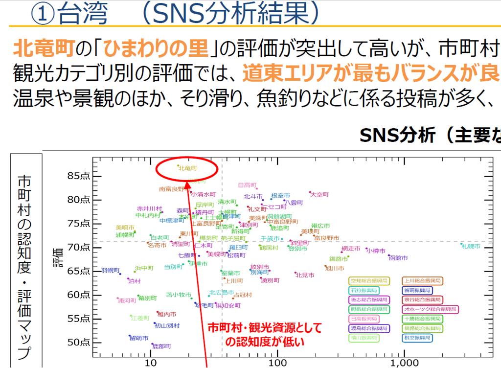 赤い丸印が北竜町の「ひまわりの里」の評価ですが、今回の分析の方法をよく読んでみると、確かに評価は抜群に高いのですが認知度としては低い結果となっていました。