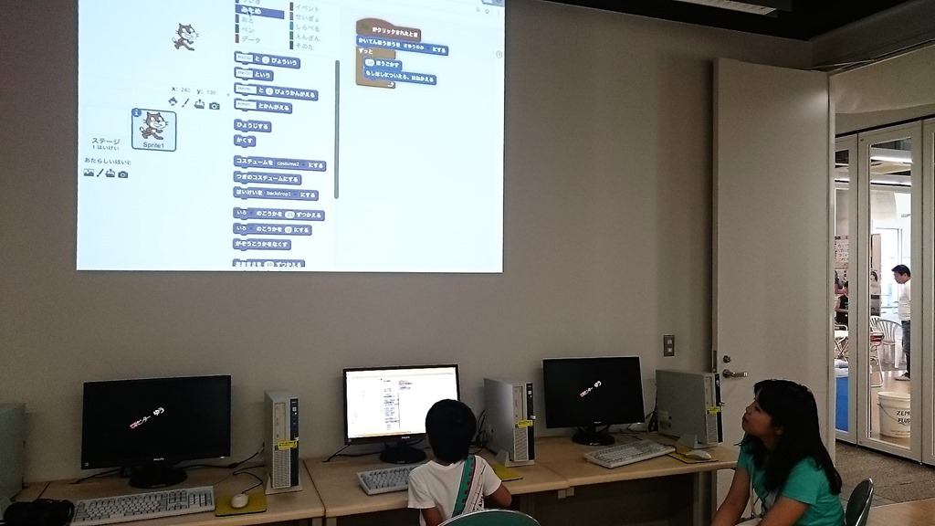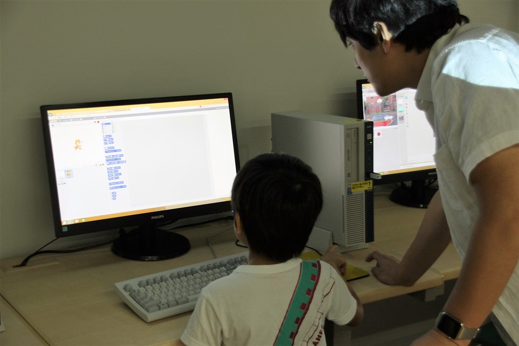 「ゆう」にはIT交流室があってパソコンが10台設置されています。本日の「ゆう楽市」で私が注目し、初めから完成まで見入ってしまったコーナーが「こどもパソコンプログラミング体験教室」でした。
