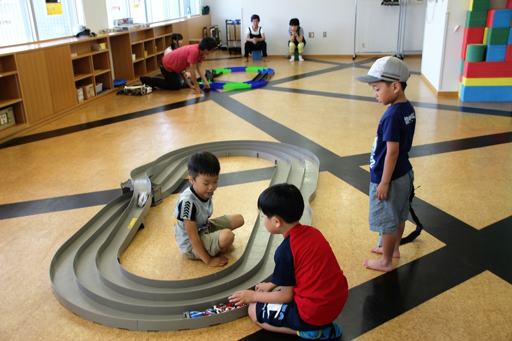 大ホールでは左の写真のwiiホームラン大会やニュースポーツ体験教室が開かれていました。そして、2階の子どもゾーンではプラレールやミニ四駆で遊ぶ゛子ども達ですが、外は30℃を超える猛暑日でしたが、「ゆう」の中はエアコンが効いていて快適。