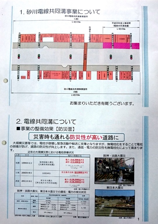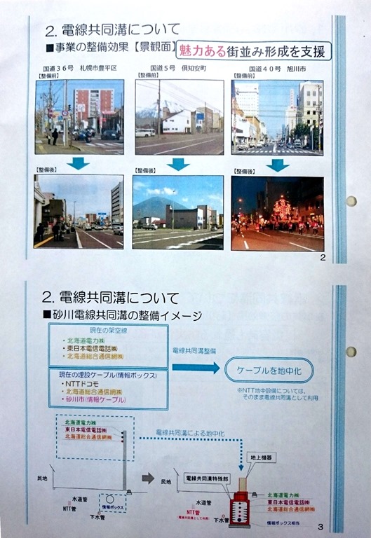 上の写真がそうですが、A4版表裏の一枚物です。無電柱化がどのようなものかが分かります。ただ、国の仕事なものですから、完成までの工期も今のところはっきりしていないのです。