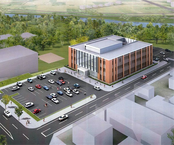 こちらが新庁舎です。左の写真は完成図でインターネットの画像から借りています。右の写真は私が昨日撮りましたが、正面玄関側は只今工事中と雨のため裏側の撮影となりました。